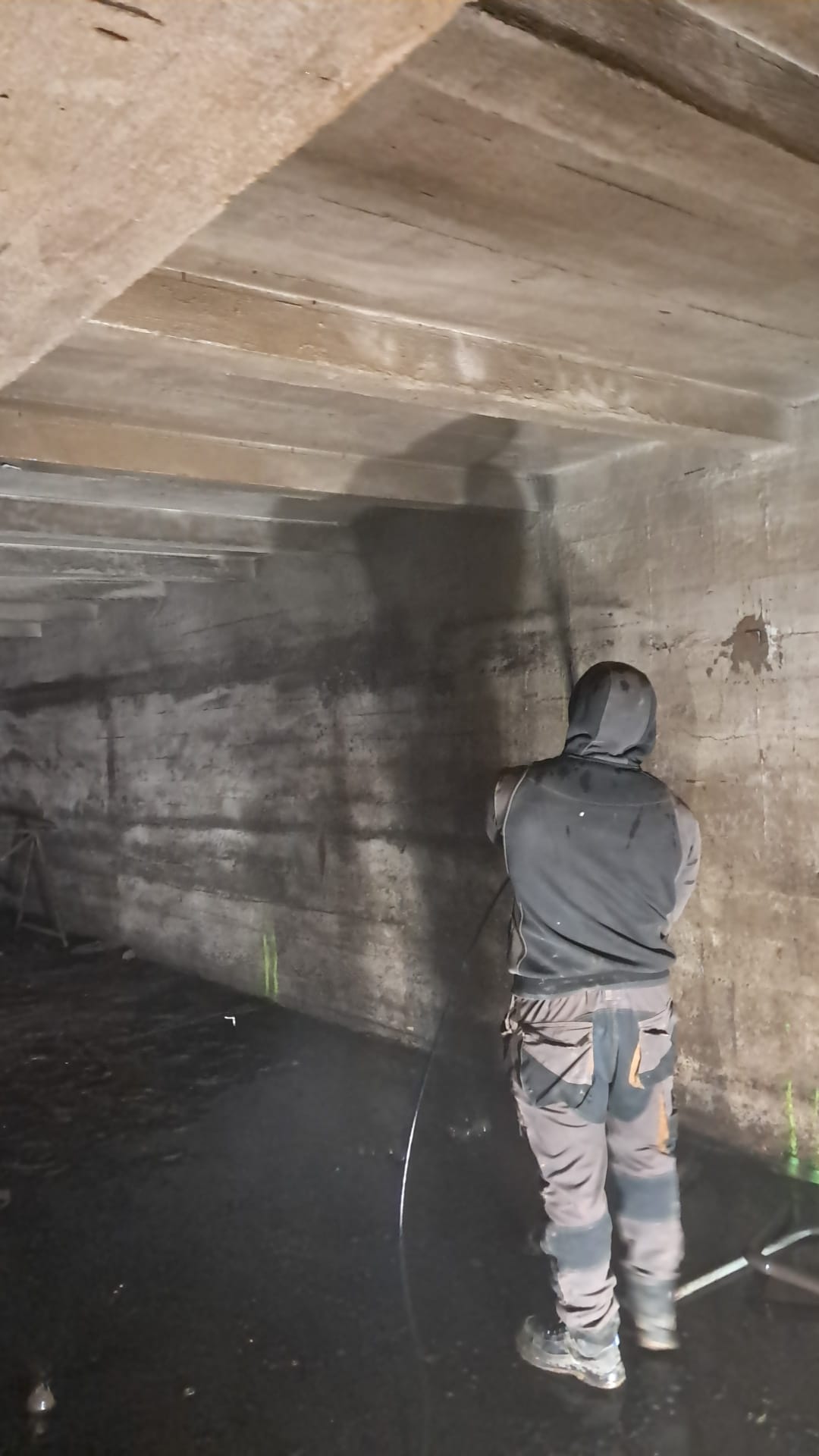 Tlakové mytí pokračuje na všech plochách, včetně stropu a nosných sloupů. Cílem je zachovat industriální patinu, ale zároveň prostor připravit na další stavební úpravy.